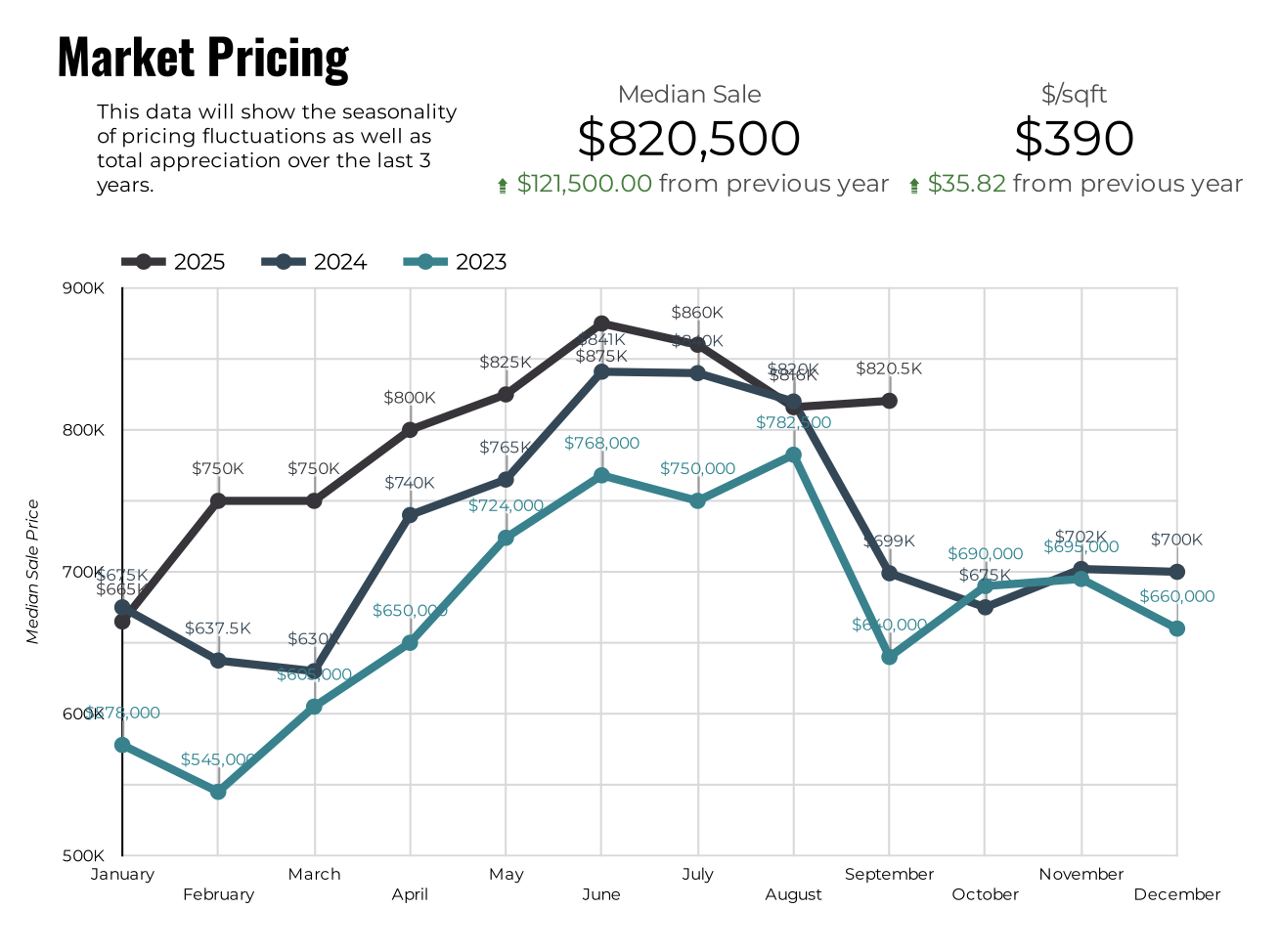 Looking at the Market Pricing charts (for Single Family Homes at the top of Page 2, for Condos at the top of Page 3), you can immediately spot the new evidence. The 2024 and 2023 lines in both charts show us what has historically happened this time of year: Home Sale Prices go down. Why would this be? Because most of the market-ready homes sold during “peak selling season”, and so what remained was predominantly the less desirable homes. Additionally, the new listings tended to be “unplanned” (read: deaths, divorces, etc…) so the homes were generally not as well-prepared for market. These realities were surmountable because Buyers in the Fall tended to be looking for bargains and accepted the compromises to the homes – but those sales occurred at lower prices than the Spring and Summer months.